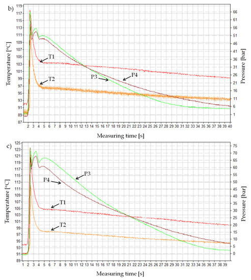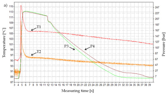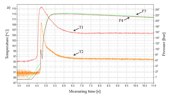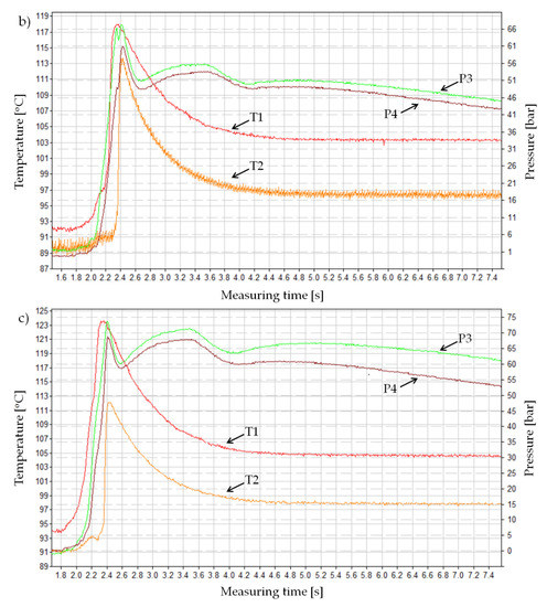 The curves of pressure and temperature changes in the mold cavity during the cellular injection of the PA66 GF30 are different from the curves registered in the standard injection process, characteristic for semi-crystalline materials. Another difference concerns the shape of the pressure curves for all variants of the injection in the MuCell® technology. An example of these changes representing the entire set is shown in Figure 7b,c and Figure 8b,c.