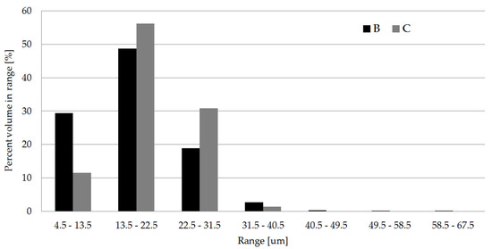 Cell size distribution for test specimens B and C calculated for section II, based on the computed micro tomography analysis.