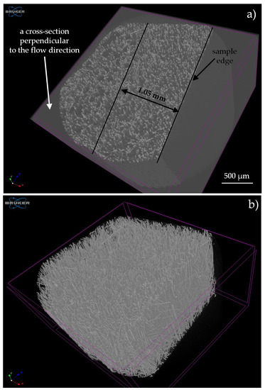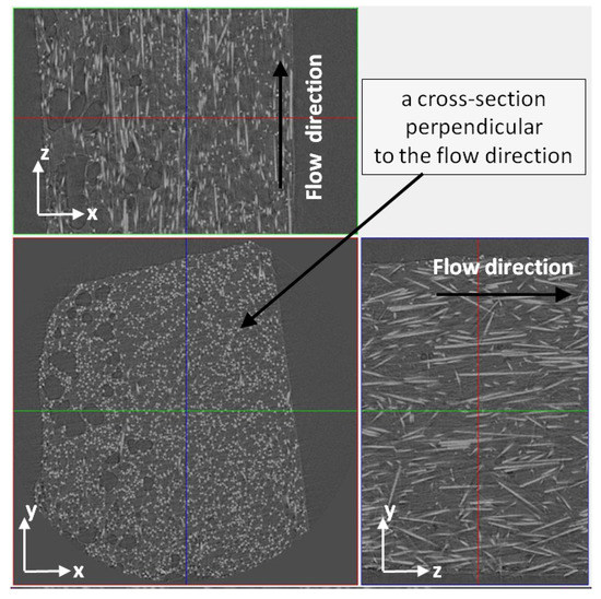 The observed structural effects were confirmed by computed microtomography images. Based on the tomographic analysis, most of the cells size (99%) is within the range 4.5 and 40.5 µm (see Figure 11). The thickness of the skin-layer for sample C calculated based on SEM images differ insignificantly from the distance between the mold surface, and the first cells in the transition area were registered by micro CT (Figure 12). It can be observed that the short fiber, around 0.4 mm, is oriented in a melt flow direction in a considerable thickness of 3.4 mm (Figure 10 and Figure 13). Actually, this orientation is noticeable in a core area as well, which is surprising taking into account the thickness of the analyzed injection molded part. Registered images allow us to observe that the nitrogen pores are deformed in the flow direction. It is a very valuable supplement to the SEM images. It can be hypothesized that despite the significant sample thickness, the cell growth was limited by the glass fibers arranged in the flow direction of the subsequent layers. The gradient of the fiber arrangement is exactly opposite from the pore distribution. The highest shear stresses occurring in the cavity-melt boundary zone resulted in an even greater orientation of the filler in this zone.