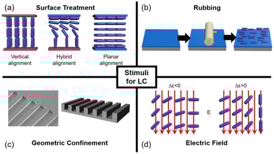A typical LC molecule has a rod-like shape, consisting of a rigid core and flexible long tails. The structural anisotropy gives distinct dielectric and optical properties along a different axis, which allows the molecules to orient in response to the surrounding environment. Several techniques have been developed to control molecular orientation in the desired way. Stimuli acting under various circumstances are covered in this review. Surface treatment, rubbing, geometric confinement, and electric fields are the chief methods that determine the molecular orientation at the frontier while possessing universality in the LC fields (Figure 1). The effect of each stimulus is described below.