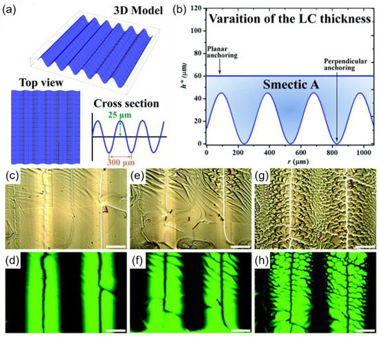 Figure 4. Smectic FCDs organized under sinusoidal micro-wrinkle confinement. (a) 3D illustration of the micro-wrinkle system with a period of about 300 μm and an amplitude of about 25 μm. (b) The surface anchoring condition at undulating interfaces and a graph showing the variation of the LC thickness. (ch) Formation of FCDs across the N-SmA phase transition. (cd) Bright field and fluorescence image of disclination line in the N phase. (ef) Bright field and fluorescence image in the N-SmA phase transition. (gh) Bright field and fluorescence image of FCDs in the SmA phase. The scale bar is 100 μm. Reprinted with permission from [35], Copyright 2020, Royal Society of Chemistry.