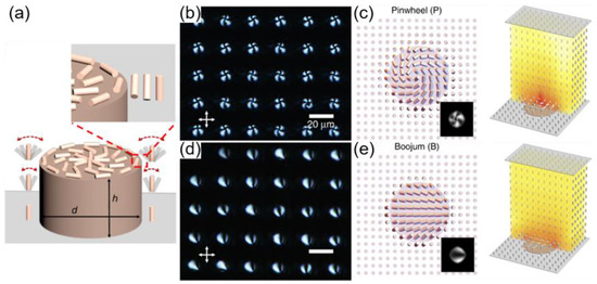 Figure 7. Periodic pinwheel (P) and Boojum (B) defects on circular posts. (a) Schematic illustration of liquid crystals on a circular post. Three-dimensional distortion is induced at the post’s edge. (b) POM images of pinwheel textures. (c) Director configuration of the pinwheel at the top of the post (left) with simulated POM images (inset) and three-dimensional reconstruction (right). (d) POM images of Boojum textures. (e) Director configuration of Boojum at the top of the post (left) with simulated POM images (inset) and three-dimensional reconstruction (right). The scale bar is 20 μm. Reprinted with permission from [67], Copyright 2019, Springer Nature.
