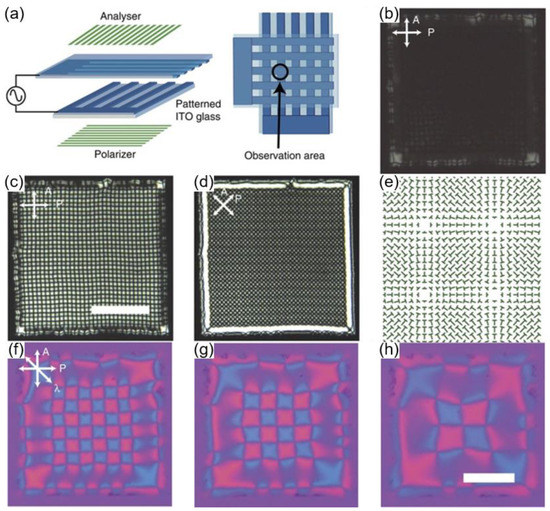 16. Suh, A.; Ahn, H.; Shin, T.J.; Yoon, D.K. Controllable liquid crystal defect arrays induced by an in-plane electric field and their lithographic applications. J. Mater. Chem. C 2019, 7, 1713–1719. [Google Scholar] [CrossRef]