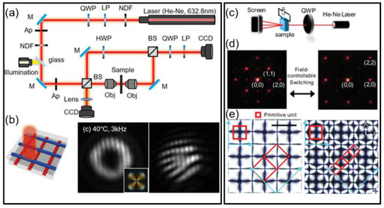 Figure 15. Application toward tunable electro-optic devices. (a,b) Reconfigurable LC defects for vortex beam generation. (a) Schematic illustration of experimental setup. The abbreviations are as follows: NDF, neutral density filter; Ap, aperture; BS, beam splitter; M, mirror; LP, linear polarizer; QWP, quarter-wave plate; Obj, objective lens; CCD, charge-coupled device camera. (b) Beam projection through the unit cell (left), the resultant beam profile (middle), and interference pattern (right). The inset image is a corresponding POM image of the −1 defect. Reprinted with permission from [15], Copyright 2019, Wiley-VCH. (ce) Dynamically controlled LC defects for the tunable diffraction grating. (c) Optical setup. (d) Field-controllable 2D diffraction patterns obtained at V = 50 V, f = 120 Hz (left), and V = 25 V, f = 280 Hz (right). (e) Their corresponding POM images, with red boxes indicating primitive units. Index of diffraction spots are provided in (d), where (0,0) implies a spot of the central laser beam. Reprinted with permission from [14], Copyright 2020, Wiley-VCH.