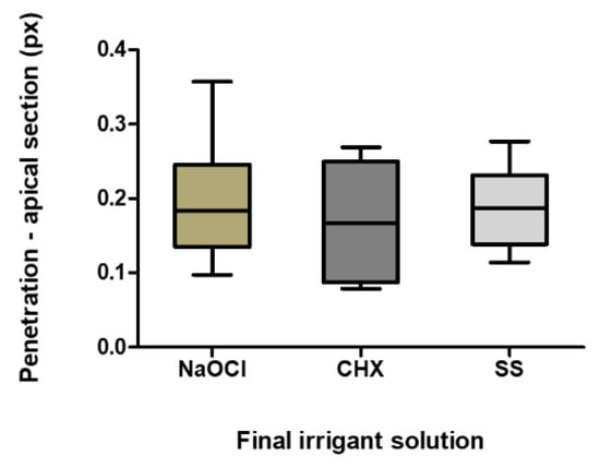 Sealer penetration in the apical sections (pixels). The boxplot shows the mean, minimum and maximum penetration of the different irrigants in the apical section.