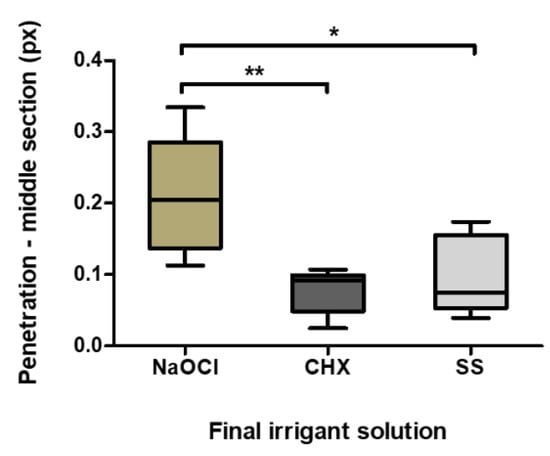 Sealer penetration in the middle sections (pixels). The boxplot shows the mean, minimum and maximum penetration of the different irrigants in the apical section. * p = 0.031; ** p = 0.004.