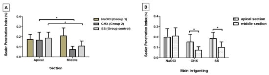 Mean percentage of sealer penetration in the two analyzed sections and in the different final irrigation protocols: A—Section analysis (pixels); * p < 0.05; B—Irrigant solution analysis (pixels); * p < 0.05.
