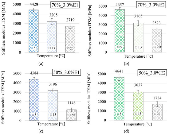 - Based on statistical analysis, assuming a 5% probability of obtaining lower stiffness modulus results, the following stiffness levels of BSM-E mixtures Stemp were determined at three testing temperatures: Stemp5 = 4000 MPa at 5 °C, Stemp13 = 2700 MPa at 13 °C, and Stemp20 = 2070 MPa at 20 °C;