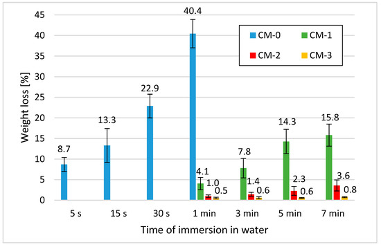 - After this first immersion stage, significant losses were noticed in the CM-0 samples, so it was decided to reduce the duration of the following immersion periods for the samples without varnish; thus, in the next three stages they were dipped for the periods of 5 s, 15 s, and 30 s, according to the above procedure;