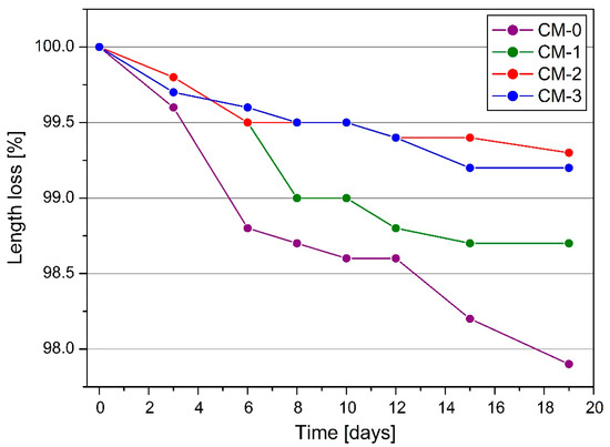 The average values of the length loss of the samples as a result of shrinkage and the standard deviation are shown in Table 4, and for better visualization of the results, the trends of the length loss over time are shown in Figure 6.