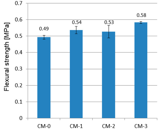 The flexural strength of the tested mortars ranged between 0.49 and 0.58 MPa and the examined admixture improved the flexural strength. The additive of 1% and 2% increased the average strength of the mortars by 10.2% and 8.2%, respectively, compared with the CM-0 formula. Samples with 3% varnish content achieved the highest strength (0.58 MPa—18.4% increase) and the smallest dispersion of results. The flexural strength of CM-2 samples was lower than CM-1, but the results were characterized by the highest standard deviation, so the test should be performed on a larger number of samples for comparison.
