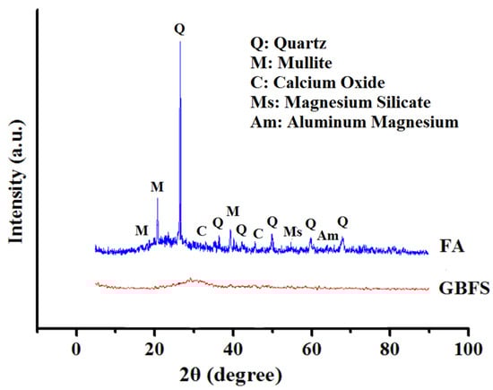Figure 1 presents the X-ray diffraction (XRD, Rigoku, Singapore, Singapore) pattern of GBFS and FA. The observed intense XRD peaks of FA at 2θ = 16–30° were due to the existence of polycrystalline silica and Al2O3. However, the prominent peaks at other angles were due to the existence of quartz and mullite crystallites. The absence of any sharp peak of GBFS verified its amorphous nature. The presence of silica and Ca peaks played an important role in the composition of GBFS and was beneficial for the AAM production. Conversely, the incorporation of FA was required to overcome the low level of Al2O3 (10.49%) in the slag.