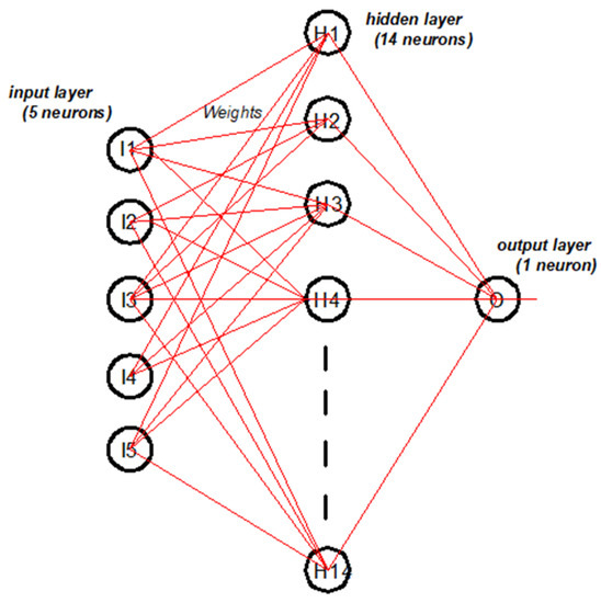 In this work, the ANN model was utilized to explain the CS of the alkali-activated concretes for obtaining the optimum values of the affecting parameters. In addition, it was intended to reduce both time and cost. The model was inspired by a natural human process. The developed model consists of three layers, as shown in Figure 3. The first layer—namely, input layer (I)—contains five neurons (parameters), which are represented by molarity, NS/NH, yeast solution to binder, GBFS/FA, and time. Then, fourteen neurons of the hidden layer (H) were used to achieve the best performing model. Meanwhile, one neuron in the third layer was used to reflect the predicted compressive strength—namely, the output layer (O).