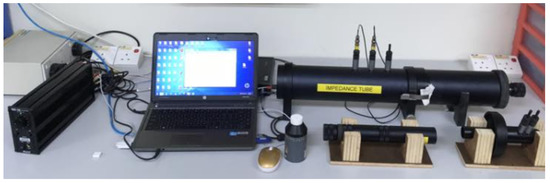 The acoustic energy absorption, reflection, and dissipation capacity of the material were obtained from the sound absorption measurements. In accordance to the ASTM E1050 stipulation, the two-microphone transfer-function (impedance tube) method was used to determine the impedance and absorption of the acoustic specimens. This method is intended for measuring the absorption coefficient and the particular acoustic impedance of sound-absorbing materials that are circular-cut in small samples, normally in the 100 to 6000 Hz frequency range (Figure 4).