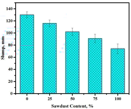 Figure 5 illustrates the slump values of the prepared concretes depending on the waste sawdust replacement levels of both sand and gravel. The results of the slump reading showed that an increasing content of sawdust replacing natural aggregates reduced the workability of the prepared concretes. The value of slump was dropped from 130 to 116, 102, 91, and 74 mm with a rise in the level of replacement of sand and gravel by sawdust from 0 to 25, 50, 75, and 100%, respectively. Typically, the concrete workability was reduced with the rise in the sawdust amounts in the mixtures. Nevertheless, the influence was more prominent at higher sawdust contents (100%). Generally, the workability of the concrete was affected by the specific surface area of the sawdust and the high water demand with a high level of sawdust in the matrix. In another way, the usage of sawdust wastes as fine/coarse aggregates essentially enhanced the concretes’ texture with several other uneven and very rough fine porous particles. Therefore, it improved the inter-particle friction accountable for impeding the fresh concrete flow. For a constant solution to binder ratio, the workability of the concretes was reduced with the increase in the sawdust amount as a substitute for river sand and crushed gravel. Several researchers [45,46,47] have obtained similar trends of results for the reduction in the workability of concrete containing lightweight aggregates. The limitations associated with the workability decrease in the concrete mixes due to the utilization of sawdust wastes as substitute for natural sand can be overcome by applying super-plasticizer.