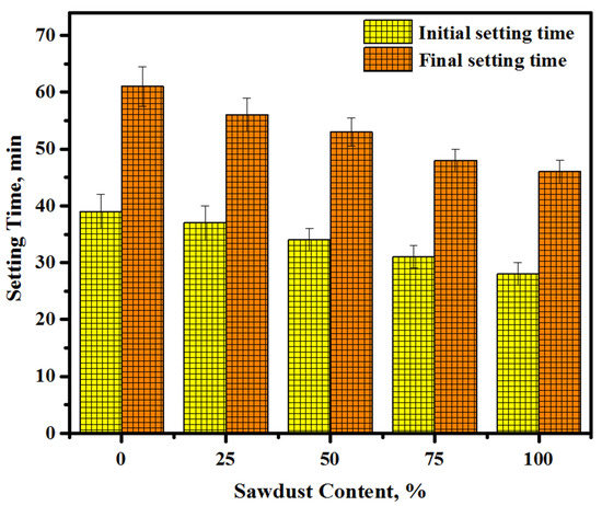 Both the initial and final setting times of the concretes produced using various amounts of the waste sawdust as fine and coarse aggregates are presented in Figure 6. Clearly, both the initial and final setting times were decreased with the increase in the sawdust levels in the concretes. For the initial setting time, the reading was decreased from 39 to 37, 34, 31, and 28 min, respectively, with an increase in the content of sawdust from 0 to 25, 50, 75, and 100%. A similar trend was found with the final setting time and reading, which was increased from 61 to 56, 53, 48, and 46 min. However, the initial and final setting time difference for each mixture was decreased with the increase in the sawdust content. Further, the difference in the setting time of each mixture is not large. The reduction in setting time with the increase in the content of sawdust addressed the high water demand of sawdust, which affected the geopolymerization process and the dissolving of alumina-silicate and calcium. An inverse relationship was observed between the sawdust waste content and the setting time of the prepared concrete. The high absorption of sawdust to alkaline solution imparted a high viscosity to the mix, which hardened rapidly. Meanwhile, the inclusion of sawdust in concrete mixtures with comparatively higher water absorptions than river sand and gravel hardened the alkaline solution-activated mixes more rapidly and decreased the setting time because of the adsorption of additional water by sawdust. Conversely, the inclusion of sawdust wastes in the alkaline system led to a reduction in the pH because of the decomposition of lignin mediated by the pH changes in the porous solution. The present outcomes are analogous to the findings of Duan et al. [48], where both the initial and final setting times were reduced for the concretes made with sawdust.