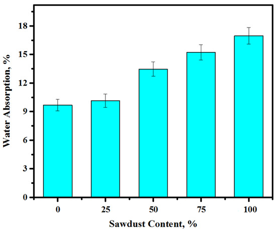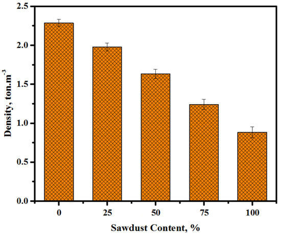 Figure 7 depicts the hardened density values of the prepared concrete containing waste sawdust as a river sand and crushed gravel replacement at the curing age of 28 days. The densities of the prepared concretes were reduced from 2.28 to 1.98, 1.63, 1.24, and 0.89 ton·m−3 when the content of sawdust was increased from 0 to 25, 50, 75, and 100%, respectively. The mixture containing 100% sawdust displayed the lowest density (0.89 ton·m−3). In addition, the low specific gravity and porosity of the sawdust considerably influenced the densities of the prepared concretes. The present outcome is consistent with the one obtained by Memon et al. [49] for concrete including a high volume of sawdust as a coarse aggregate. Likewise, these findings contributed to improving and developing the high-performance lightweight alkali-activated concrete, which was supported by the results reported by Sales et al. [50]. They assessed the possible uses of lightweight concretes made from coarse aggregates via water treatments of sludge and sawdust.