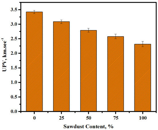 Figure 8 shows the influence of various sawdust amounts on the ultrasonic pulse velocity (UPV) values of the prepared concretes. An increase in the sawdust level from 0 to 25, 50, 75, and 100% caused reductions in the corresponding UPV readings of the concretes from 3.42 to 3.02, 2.79, 2.57, and 2.32 km/s at 28 days of curing age. This drop was due to the porous nature of the sawdust, which negatively influenced the densities and microstructures of the prepared concrete. It is evident that, with the increasing content of sawdust and decreasing amount of river sand/crushed gravel, the UPV of the prepared concretes was decreased, which was ascribed to the increase in the sawdust-mediated porosity. The present findings agreed well with those of a previous study [47].