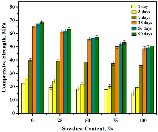 Figure 9 shows the CS vales of the concretes containing various levels of sawdust as a substitute for sand and gravel aggregates. For each mixture, three samples were examined and the average reading was adopted. The CS of the prepared concrete was measured at the curing age of 1, 3, 7, 28, 56, and 90 days. The CS was constantly augmented with the increase in the curing age. At an early age (after 24 h), with an increase in the level of replacement of river sand and gravel by sawdust from 0 to 25, 50, 75, and 100%, the early strength dropped from 22.6 to 19.4, 18.3, 17.8, and 15.2 MPa, respectively. Beyond 28 days of the age, a comparable development was seen wherein the CS was decreased from 65.8 to 61.1, 55.7, 50.4, and 48.6 MPa with the sawdust contents increased from 0 to 25, 50, 75, and 100%, respectively. Analogous behavior was found at the late age of 90 days. where the strength loss percentage was increased with the increase in sawdust levels in the concrete matrix. It was found that the concrete achieved more than 96% compressive strength at 28 days from the total strength measured at 90 days for all mixtures, and this finding agrees with the previous finding by Ranjbar [22] and Islam [51]. However, it was found that the loss in strength was reduced with time and the percentage of loss with 100% sawdust dropped from 32.7% at an early age (1 day) to 26.1% at an age of 28 days and up. Consequently, the total reduction in CS with an increase in the sawdust content was addressed to three reasons. The first reason was that waste sawdust revealed a higher ability of water absorption than river sand and crushed gravels. Nonetheless, the varied distribution the water mixing with the concretes matrix could weaken the chemical bonds in alkali-activated paste (GBFS + FA) and aggregates. The second reason was that the shape of sawdust partials compared to those of natural aggregates made the bond between the paste and the aggregate weaker and thus there was a reduction in the concrete CS. The third reason was that the existence of organic matter led to a reduction in the aggregate-paste bonds and increased the porosity, thereby affecting the concrete CS. The fourth reason was that the substitution of the stronger substance via the weaker one and the lack of the pozzolanic action by the sawdust waste also affected negatively the strength development. This finding was consistent with the previous reports of Kanojia and Jain, S. [52], Martínez-García et al. [53], and González-Fonteboa et al. [54].