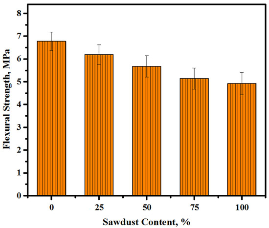 The flexural strength (FS) of the LWCs were measured to evaluate their capacity for resisting the deformation when subjected to load. The FS tests of alkali-activated concretes prepared with various levels of sawdust wastes as a substitute for river sand/crushed gravel aggregates were conducted after curing for 28 days. For every mixture, the mean values of three samples were evaluated, as presented in Figure 10. The prepared specimens’ FS changes dramatically with the level of sawdust replacement of natural aggregates. It decreases from around 6.8 MPa at a 0% content to 6.2, 5.7, 5.1, and 4.9 MPa at an increasing level of sawdust to 25, 50, 75, and 100%, respectively. In terms of sawdust-based fine and coarse aggregates in alkali-activated lightweight concrete, a 100% sawdust addition exhibits the highest effects on the FS value and the concrete specimen’s loss of more than 27% flexural strength with a rise in the sawdust level from 0 to 100%. However, the FS for all mixtures achieved an acceptable strength for construction applications.