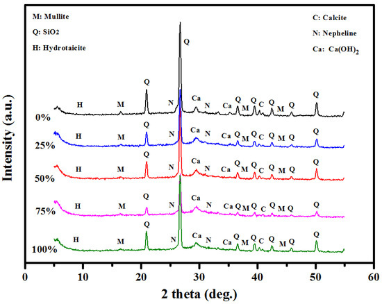 Figure 12 shows the XRD results of the prepared concrete containing various levels of sawdust as well as fine/coarse aggregates as a substitute. Peaks corresponding to the crystalline quartz (SiO2), calcium hydroxide (Ca(OH)2) and mullite (3Al2O3·2SiO2 or 2Al2O3·SiO2) phases were seen. These phases appeared from FA and GBFS. The intensity of the Ca(OH)2 diffraction peak was decreased with the increase in the sawdust amount from 0 to 25, 50, 75, and 100%, where less Portland was generated as well as a higher amount of quartz emerged to be non-reactive with 75 and 100% of sawdust (Table 5). These were produced from the chemical reaction among the amorphous fractions of FA/GBFS containing minor crystalline phases. The XRD peaks of OPC, CaCO3, and mullite were evidenced at 28–50°. As the sawdust contents were increased, the intensity of the XRD peak at 50.1° corresponding to the crystalline quartz phase was increased. The mullite peak at 16° for 25% sawdust also showed a lower peak intensity than the control specimen. In addition, the intensities of these peaks revealed a decreasing tendency with the increase in the sawdust contents. The peaks observed at 24° and 33.8° were assigned to the Nepheline (Na3KAl4Si4O16), where the peak intensity was reduced with the increase in the sawdust levels.