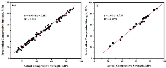 ATLAB software was used to develop the proposed ANN model. Specifically, the best neuron number in the hidden layers was found to be fourteen during the iteration process. This result led to achieving the targeted performance of 0.01 related to the learning rate of 0.2. The measured data were divided into three parts—namely, training, testing, and validation. The ANN training with 124 tests was taken into account, while 14 and 23 tests were utilized for the validation and testing steps, receptively. The ANN training proceeded until it minimized the correlation value, in which a correlation value of 0.991 was achieved, as shown in Figure 13a. Whereas, the correlation value of the testing results is 0. 9878 (Figure 13b). Moreover, the mean error was considered to evaluate the efficiency of the network during the training and testing steps. In particular, the mean error (M) for the training data was noticed as 1.377, as shown in Table 6. These indicators values predicted the experimental data well, where the predicted CS was extremely close to the measured one.