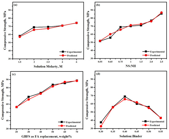 Predicted and actual evolution of alkali-activated strength as a function of (a) molarity, (b) NS/NH, (c) FA/GBFS, (d) and solution to binder ratio.