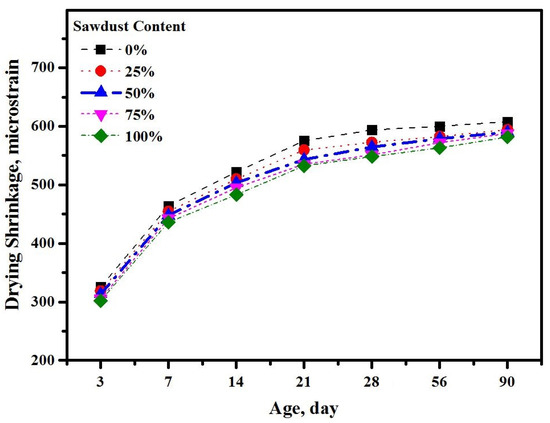 - Replacing the natural aggregates with sawdust led to a decrease in the drying shrinkage of the tested specimens.