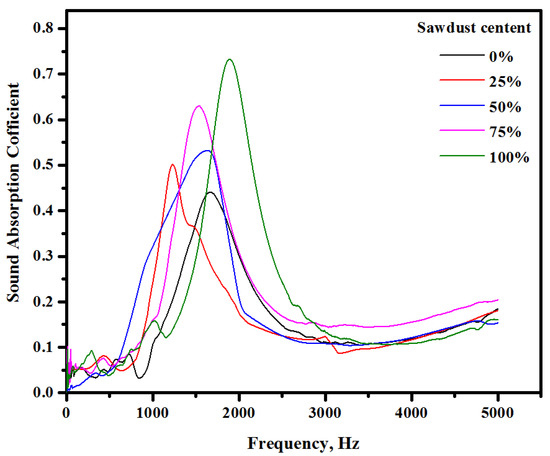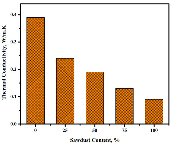 Currently, researchers are facing a great challenge because of the constant increase in the demands of high-performance lightweight concretes (LWCs) as construction materials, where the manufacturing of novel construction materials from recycled industrial wastes has become a strategy. In this view, the advancement of LWCs via the use of sawdust wastes as lightweight aggregates is evaluated. The functions of sawdust in cements/concretes have been assessed by several researchers, and it has been used to make lightweight concretes in the past [5]. The thermal traits of sawdust-based cement composite have been reported [6], wherein its inclusion in the concrete matrix was found to significantly reduce the thermal conductivity by up to 20% compared to that of normal concrete (0% sawdust). Such a considerable decrease in the conductivity values was ascribed to the lowering in density and increased porosity of the lightweight concrete composites modified by sawdust wastes. Oyedepo et al. [7] used sawdust wastes as a substitute for fine aggregates (natural) at different contents from 0% up to 100% in standard heavyweight concretes, and showed that a ratio of more than 25% substitute to natural aggregates can negatively influence the concrete’s strength properties and density. Other researchers have also made comparable observations when sawdust was used in concrete at various levels (10%, 20%, 30%, and 40%) as a substitute for sand. It was suggested that an amount of sawdust at up to 10% substitution for sand could produce a better density and mechanical strength of concrete [8]. Boob [9] also used sawdust as a substitute for fine aggregates (0–15%) in concrete. Mageswari and Vidivelli [10] showed that sawdust ash as an agent to replace natural sand may be an appropriate choice for fine aggregates in concretes. It can significantly decrease the sawdust waste clearance problem and concurrently allow the conservation of natural fine aggregates. The authors found that concrete including sawdust possessed unique characteristics and presented better outcomes for the thermal and mechanical characteristics of the cement-based composite, making it economical compared to various other materials in the construction sector.