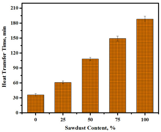 In developed countries, buildings are large consumers of energy and saving energy is the main concern. The energy consumed in buildings can be saved effectively by increasing their thermal insulation, which is vital for countries with hot and cold climates and a high energy demand. Thermal insulation is required to decrease the total energy usage in buildings and add to unusual regenerative energy resources for sustainability. The heat transfer was measured for the cylindrical specimen of diameter 150 mm and height 300 mm. After 28 days of casting, the dried surface of the specimen was covered by a plastic sheet to prevent the excess entry of water. A PVC pipe (20 mm of diameter) was used to protect the thermocouple from unexpected impacts. All the samples were put in a water container at 34 °C. Then, the temperature of the water was slowly increased up to 100 °C, wherein the first measurement was conducted. Next the heater was turned on to record the interior temperature of the specimen using a K thermocouple, data loggers, and computers. During the immersion of the sawdust concretes in water, the temperature of the heater was increased, thereby increasing the water volume. Such a rising temperature of water was recorded at close intervals in the first 24 h up to 100 °C. However, the transferred heat was measured later and rather frequently until the water temperature came down to boiling point.