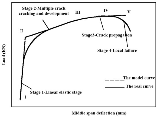 It can be seen from Figure 1, according to the changes of fiber toughening effect and crack development mode, that the specimen can be roughly divided into four stages from the initial stress to the final failure. Stage 1 is the elastic stage, in which the external force borne by the matrix is much larger than that of PVA fiber, and the deformation of the material is composite Hooke’s law. The end point of this stage is that the first crack appears in the matrix, that is, the stress of the composite material reaches the cracking strength point (bending proportional strength limit point). Stage 2 is the multiple-crack cracking and development stage (also known as the yield stage). At this stage, stress is transferred back and forth between the matrix and the fiber, resulting in a large number of fine cracks in the matrix. When the specimen no longer produces new cracks, this stage ends, and the end point is also called the yield point. Yield points are sometimes determined by the Feng et al. method [23]. Stage 3 is the crack propagation stage, in which no new cracks are generated. However, the crack width and mid-span deflection of the specimen continue to increase until the weakest crack of the specimen is rapidly destroyed. If this stage is longer, it indicates that PVA fiber has a good effect on the matrix, the crack width in the specimen is small, and the deflection of the specimen is also large, with a good deformation effect. The increase of fly ash content will also increase the peak load and deformation capacity of specimens [24]. Stage 4 is the local failure stage. At this stage, the bearing capacity of the specimen decreases, most of the fibers on the fracture surface of the specimen will be pulled out, and the specimen will be destroyed. Although the ACK model curve is somewhat different from the actual curve, it can well reflect the mechanical state of the matrix and provide guidance for the design of thin plate’s load and deflection.