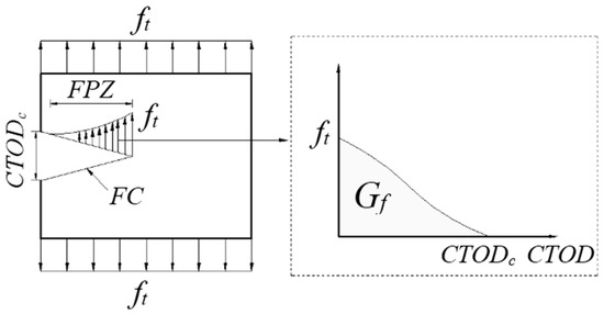 The FC model was proposed by Hillerborg et al. [27]. Its characteristic is that the stress at the crack tip of concrete is non-singular, and there are many micro-crack areas, which is called the fracture process zone (FPZ). The FPZ in concrete can be replaced by a fictitious crack. When the stress at the fictitious crack tip reaches the tensile strength () of the matrix, the fictitious crack begins to expand. FPZ and are perpendicular to each other. There exists cohesive stress on the fictitious crack surface, and the cohesive stress decreases with the increase of crack width. The cohesive stress and crack opening follow the softening curve of concrete, as shown in Figure 2 and Figure 3. According to elastic modulus (), and fracture energy (), the tensile softening curve of concrete can be calculated, and then the FC model can be established [28]. Figure 1 shows the feature curve of the FC model, when the crack is in a critical state, the fictitious crack tip stress reaches the tensile strength of the concrete material , the crack opening displacement is maximized, and the stress is 0. Research results for the FC model indicated that the subcritical expansion of concrete cracks before their failure is the main reason for the size effect of the concrete fracture toughness [29].