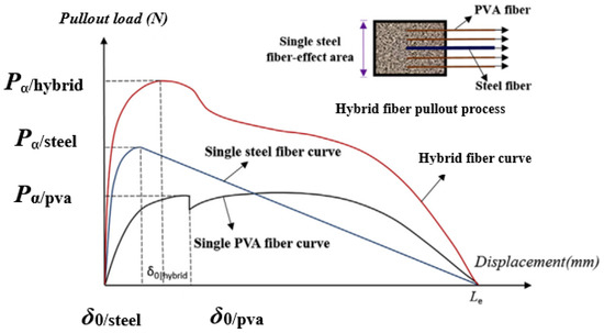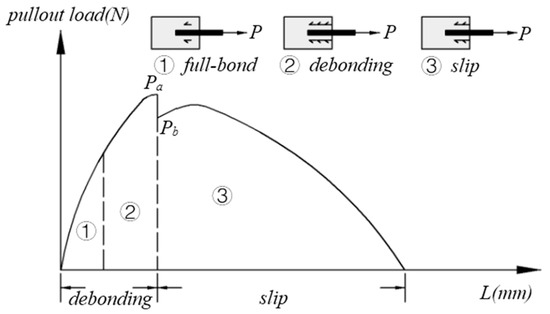 As shown in Figure 8, when the cementitious composite is subjected to an external load of at the beginning, the PVA fiber in the base is in the bonding stage. When the load decreases from to , the chemical bond between the PVA fiber and the matrix is broken, and the de-bonding criterion of the fiber in the matrix conforms to the fracture criterion. When the external load is , the PVA fiber exhibits the phenomenon of slip-hardening in the matrix. The fiber is pulled out when the load exceeds the tensile strength of the fiber [45].