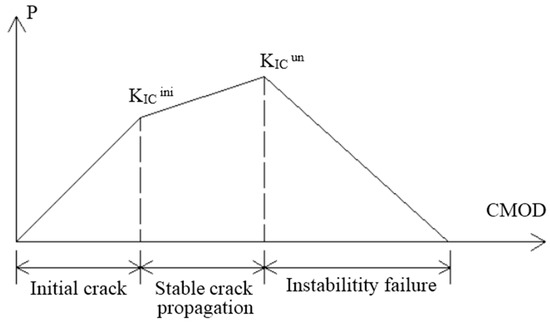 On the basis of linear superposition and the FC model, Xu and Reinhardt equated the crack length at any moment after concrete crack initiation to the sum of the elastic stress crack length and the elastic virtual crack length, establishing the DKF model. They considered the effect of the cohesive force in the fracture process area. This model is mainly aimed at solving the characterization problem for the entire process of concrete fracture [49]. The DKF model introduces the initial fracture toughness and the unstable fracture toughness , which can describe two different fracture transients of concrete. (the control parameter) is calculated using LEFM, according to the initial load () of the crack and the initial crack length . The fracture toughness calculated using the peak load and the corresponding critical CMOD via the same LEFM equation is called . The DKF model divides the concrete fracture process into three stages: crack initiation, stable expansion, and unstable expansion, as shown in Figure 9, it can be expressed as follows [48]: