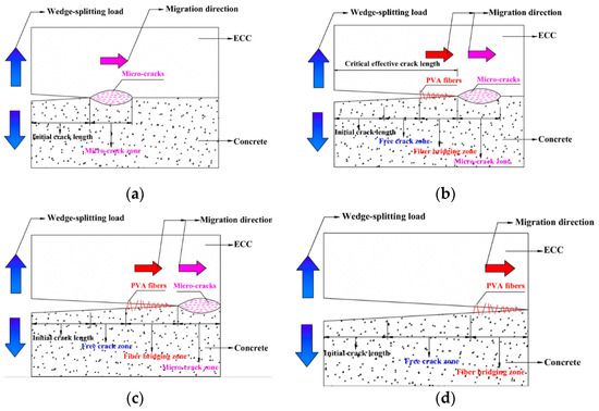 The matrix itself has micro-cracks, and when the matrix is subjected to the external splitting load to a certain extent, the micro-cracks will eventually form a large crack, and P-CMOD also starts to show nonlinearity (Figure 10a). The fiber bridging zone and the micro-crack zone at the crack tip in the matrix also lead to the nonlinear fracture of the matrix (Figure 10b). While in the micro-crack area, large cracks eventually formed until the end of the specimen (Figure 10c), and only fiber bridged cracks were found in the final matrix (Figure 10d). Therefore, the fiber bridged zone and the micro-crack zone at the crack tip in the matrix are the characteristics of its nonlinear fracture [50]. Therefore, the fracture process of the double-K model can be used to easily judge the state of the matrix.