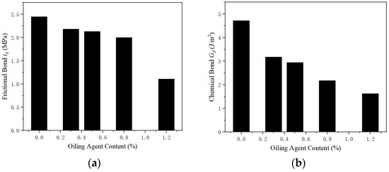 , the friction stress () and the slip-hardening coefficient () are the three parameters of this model. There is no in the matrix of SF or polypropylene fibers, only and and for matrices containing SFs, polypropylene fibers, and PE fibers. decreases with reductions in the and concentrations in the matrix. This is because the –(OH) in PVA fibers can form ionic bonds with and in the matrix. can be used to simulate the fracture phenomenon caused by the matrix interface slippage. is mainly affected by the compactness, stiffness, and roughness of the interfacial transition zone between the fiber and the matrix. A larger indicates that the fiber and the matrix can better resist the slippage of the pulled fiber, but increasing increases the breakage probability of the fiber during the pullout process and reduces [47]. The interfacial micromechanical parameters and are defined by Equations (17) and (18), respectively: