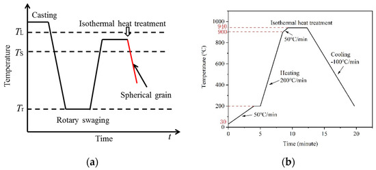 (a) Schematic diagram of the rotary swaging strain-induced melt activation (RSSIMA) process (TL: liquidus, TS: solidus, and Tr: room temperature) and (b) actual heating cycle during high-temperature confocal laser scanning microscopy (HT-CLSM).