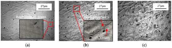 The in situ microstructural evolution of as-received C5191 alloy was observed from room temperature to the semi-solid state (Figure 3). Notably, no obvious change in microstructure was observed up to 645.7 °C (Figure 3a). At 700.1 °C, the statically recrystallized micro-grains emerged and covered the sample surface. The recrystallization starting temperature is clearly higher than its rotary swaged counterpart. The mean grain size was found to be ~6 μm and the grain boundaries became more evident. The recrystallized grains rapidly coarsened with increasing temperature because of the grain boundary migration (Figure 3b,c). Furthermore, the grain boundaries and local points in the interior of grains started to melt at 893.5 °C and the mean grain size increased to about 25 μm (Figure 3d). Moreover, the liquid phase diffused toward the grain interior and precipitated in the form of black spots at 895.9 °C (Figure 3e). When the temperature was further increased to 940 °C and held for 4 min, a large amount of second-phase particles appeared on the sample surface (Figure 3f). The solidification was carried out at a cooling rate of 100 °C/min and microstructural changes were recorded. Herein, heterogeneous nucleation occurred and the liquid phase was completely solidified at 878.9 °C (Figure 3g,h). During solidification, no obvious liquid caps appeared. The solidification microstructure of as-received C5191 alloy consists of coarse grains, a large number of rose-like grains, and a small number of spherical grains, wherein the maximum grain length was 500 μm (Figure 3i). Moreover, severe liquid phase segregation was observed in the microstructure.