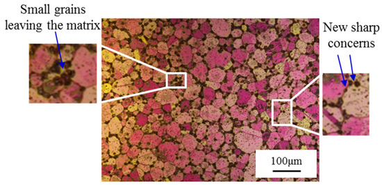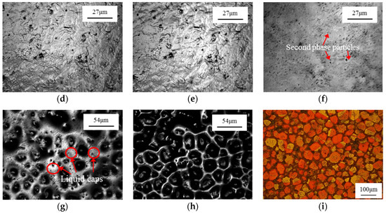 The melting point of the grain boundary intersections drops with the increase in gains’ curvature. Moreover, small grains with a lower melting point are widely distributed in the grain boundaries and inside the grains. Therefore, for equiaxed crystals, the small crystal grains at sharp corners and solid particles on the grain boundary usually melt first. The microstructure of the early stage temperature holding period is shown in Figure 5. A discontinuous liquid phase appears on the grain boundary; at the same time, a large amount of small liquid phase is dispersed in the crystal grains. The liquid phase interface expands with the temperature rising or the holding time increasing. The sharp corners on the grain boundary will be separated from the matrix by the gradually connected liquid phase, forming small crystal grains, which have a lower melting point and melt. As time goes by, the grain boundaries of polygonal equiaxed crystals basically turn into arcs, forming a spherical shape with a liquid phase inside. Finally, a solid–liquid coexistence microstructure with spherical crystal grains is formed. In the same way, the equiaxed crystal structure in the raw material will also undergo a similar spheroidization process. It can be inferred that both the microstructures of the rotary swaged materials and raw materials may be spherical structures during the temperature rising and the holding period of the IHT. The spherical structure in Figure 2i and the remaining spherical structure in Figure 3i prove the correctness of the above theoretical inference.