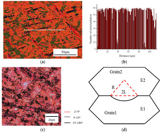 The refinement mechanism of grains during strain-induced melt activation (SIMA) requires further explanation. Based on the static recrystallization theory, the recrystallization temperature increases with decreasing prior deformation strain and increasing starting grain size. Meanwhile, the recrystallized grain size highly depends on the deformation structure (e.g., deformation strain or dislocation densities), annealing conditions and orientations among neighboring grains, original grain size, solute and second-phase particles, and so on [17,18]. Figure 4 shows the misorientation distribution maps of the rotary swaged C5191 alloy with the radial strain of 0.2 by electron backscatter diffraction (EBSD). Orientations among neighboring grains are highly different in the line of the Figure 4a, due to both deformation banding and twinning [19], where a high number of boundaries exceeded 60°. Moreover, there is a high number of high-sized local misorientations and variations in the sub-grain morphology. Besides, the rotary swaged C5191 alloy has a high dislocations density due to the high proportion of low-angle grain boundaries (GBs) [20,21]. The increased driving force (stored energy) arising from the dislocations and particle stimulated nucleation, which are generated by the deformation, is well-known. Therefore, a higher deformation strain of the rotary swaged samples will provide more dislocations and a high amount of the misorientation of neighboring grains.