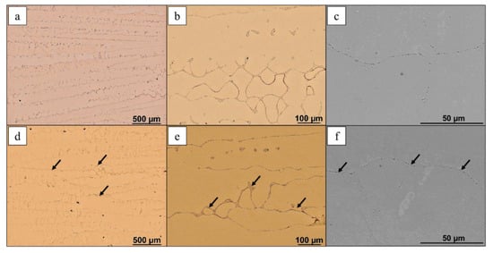 Cross section (a–c) and longitudinal section (d–f) of ETP grade copper strand. Light microscope, magnification (a,d) ×100, (c,d) ×500. SEM, secondary electron (SE), magnification (e,f) ×1000.