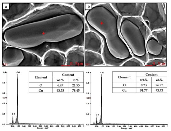 EDX analysis of the material did not show any other than presented Cu2O oxides inclusions. Each of the analysed particles of Cu2O confirmed the atomic ratio of oxygen to copper to be approximately 1:3, which is in agreement with stoichiometry of the Cu2O compound. The shape has been identified to be axi-symmetrical and oval with the size of approximately 2–5 μm.