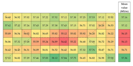 Homogeneity of the structure and therefore the correctness of the strand casting process of copper was determined by electrical conductivity test using eddy current device. Figure 5 presents the results of electrical conductivity of the strand measured at the cross section. Electrical conductivity tests were carried out as an additional and complementing the structural images verification of the macrosegregation in the casted strand which was assumed due to the asymmetric structure of the strand resulting from the construction of the casting mould. For a more detailed analysis the mean values of electrical conductivity for the entire cross section and for each row were calculated.