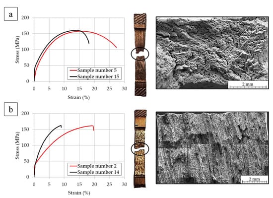 Stress-stress curves along with the images of the tested samples after uniaxial tensile test and a panoramic image of the fracture, where (a) samples number 5, 15 (b) samples number 2, 14 (according to Figure 6).