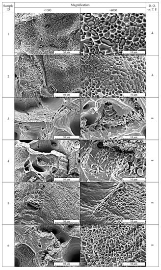 SEM analysis of the fractures after uniaxial tensile test of the samples prepared perpendicularly to the tensile force direction (see Figure 6). SEM, SE, magnification ×1000 and ×4000.