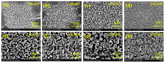SEM surface morphology of the MoS2 films at different deposition–annealing temperatures: (a) 50–400 °C, (b) 100–400 °C, (c) 200–400 °C, (d) 300–400 °C, (e) 50–600 °C, (f)100–600 °C, (g) 200–600 °C, (h) 300–600 °C.