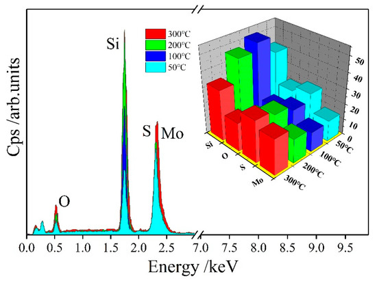 Figure 3 shows the EDS spectrum of the MoS2 films prepared at different deposition temperatures, and the insets show the contents of the corresponding elements. In accordance with the EDS data, the elemental ratios of S and Mo in the films are 1.86:1, 1.62:1, 1.55:1, and 1.18:1 at 50 °C, 100 °C, 200 °C, and 300 °C, respectively. The chemical ratio of molybdenum and sulfur in the actual films gradually decreases compared with the target chemical ratio with the increase in deposition temperature. This condition shows that the plasma energy increases with the increase in temperature, thereby destroying the S–Mo–S structure and forming a non-MoS2 chemical ratio structure. In Figure 3, a strong silicon element peak and an oxygen element peak appear. The silicon is attributed to the substrate single crystal silicon, and the oxygen element comes from the background atmosphere of the vacuum chamber.