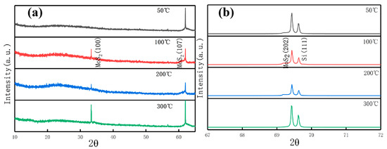 Figure 4 shows the XRD pattern of MoS2 films prepared at different deposition temperatures. As shown in Figure 4a, each deposition temperature has a sharp peak at 62° corresponding to MoS2 (107), and a relatively weak peak corresponds to MoS2 (100) when the deposition temperature is higher than 50° at 33.3°. As shown in Figure 4b, two sharp peaks appear at 69.4° and 69.6° corresponding to MoS2 (202) and Si (100), respectively, the 33.3° peak corresponds to MoS2 (100), and the 61.9° peak corresponds to the MoS2 (107) plane, it is consistent with the XRD data in the literature [6,31,38]. Combined with the SEM results, the films are granular when the deposition temperature is low, and the growth rate is fast around this time. Thus, the crystallinity of the MoS2 (107) and MoS2 (202) surfaces is high. as the deposition temperature increases. The number of “feet” of the films gradually increases with the increase in deposition temperature when the film structure is “striped” to form a network structure. In particular, the number of “feet” is the largest at the temperature of 300 °C. Thus, the (107) and (202) faces of MoS2 have the highest crystallinity compared with 100 °C and 200 °C. This finding shows that the high deposition temperature in the “stripe” structure is beneficial to the growth of the lateral structure of the films. The MoS2 (100) surface only appears when the deposition temperature is high, which may be related to the growth of the films perpendicular to the substrate when the deposition temperature is high. These findings are in accordance with the SEM analysis of the MoS2 film surface structure changes with the deposition temperature.