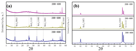 XRD spectrum of the MoS2 films prepared at 200 °C after annealing at 400 °C, 600 °C, and 800 °C. Different diffraction angle range: (a) 2θ = 5°~60°, (b) 2θ = 60.5°~71.5°. (Picture a and b are continuous, and picture a is magnified)