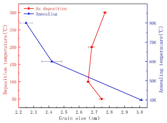 Figure 5 shows the XRD pattern of the MoS2 films prepared at 200 °C then annealing at 400 °C, 600 °C, and 800 °C. As shown in Figure 5b, a strong peak appears at 62 °C after annealing for the MoS2 (107) plane, and the peak is more intense than before annealing. The peak value intensively changes with the change in annealing temperature. Figure 5a shows the small peaks of Mo and MoO3 [39]. This condition is because annealing desulfurization occurs after annealing, resulting in a small portion of MoO3 and Mo crystals. In accordance with the XRD spectrum, the grain size of the MoS2 films can be calculated using the Scherrer formula. The calculated results are shown in Figure 6. For the change in the grain size of the thin films at different deposition temperatures, the average grain size of the MoS2 films with a granular structure is larger than the average size of the “stripe” structure. This condition shows that the growth modes of the two different film structures are completely different. The film grain size of the “stripe”-like structure regularly increases, indicating that the higher the deposition temperature, the better the crystallization of the “stripe”-like film structure. In accordance with the film deposited at 200 °C, the grain size of the films with different annealing temperatures can be clearly observed with the rapid decrease in grain size and increase in annealing temperature, and the change rule of the grain size is in line with the phenomenon observed in Figure 2 that the surface morphology of the annealed film becomes loose as the annealing temperature increases. The films deposited at 200 °C have a large increase in grain size before and after annealing at 400 °C, indicating that a low annealing temperature is beneficial to the crystallization of the films. The films deposited at 200 °C are annealed at 600 °C or 800 °C, and the grain size is immensely reduced, thereby increasing the grain boundary area. This condition reduces the physical and chemical properties of the films, increases their impurities, and increases the film’s hardness and plastic toughness [40].